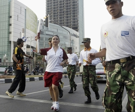 the flame on a 8 km (5 miles) journey through Jakarta. This is part of its