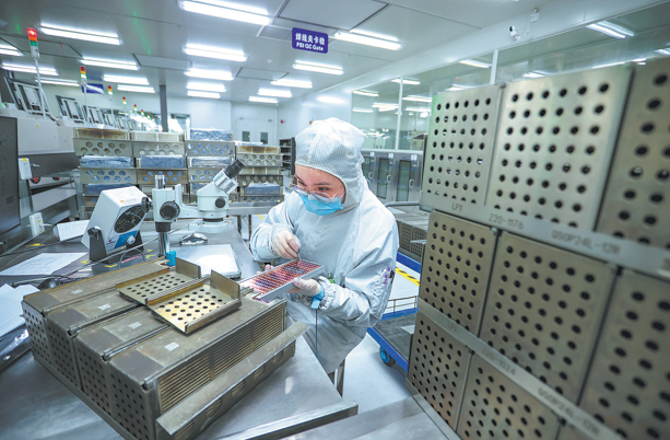 A worker tests chips in the clean room of a microelectronics company in Suining, Sichuan province, on July 14. LIU CHANGSONG/FOR CHINA DAILY