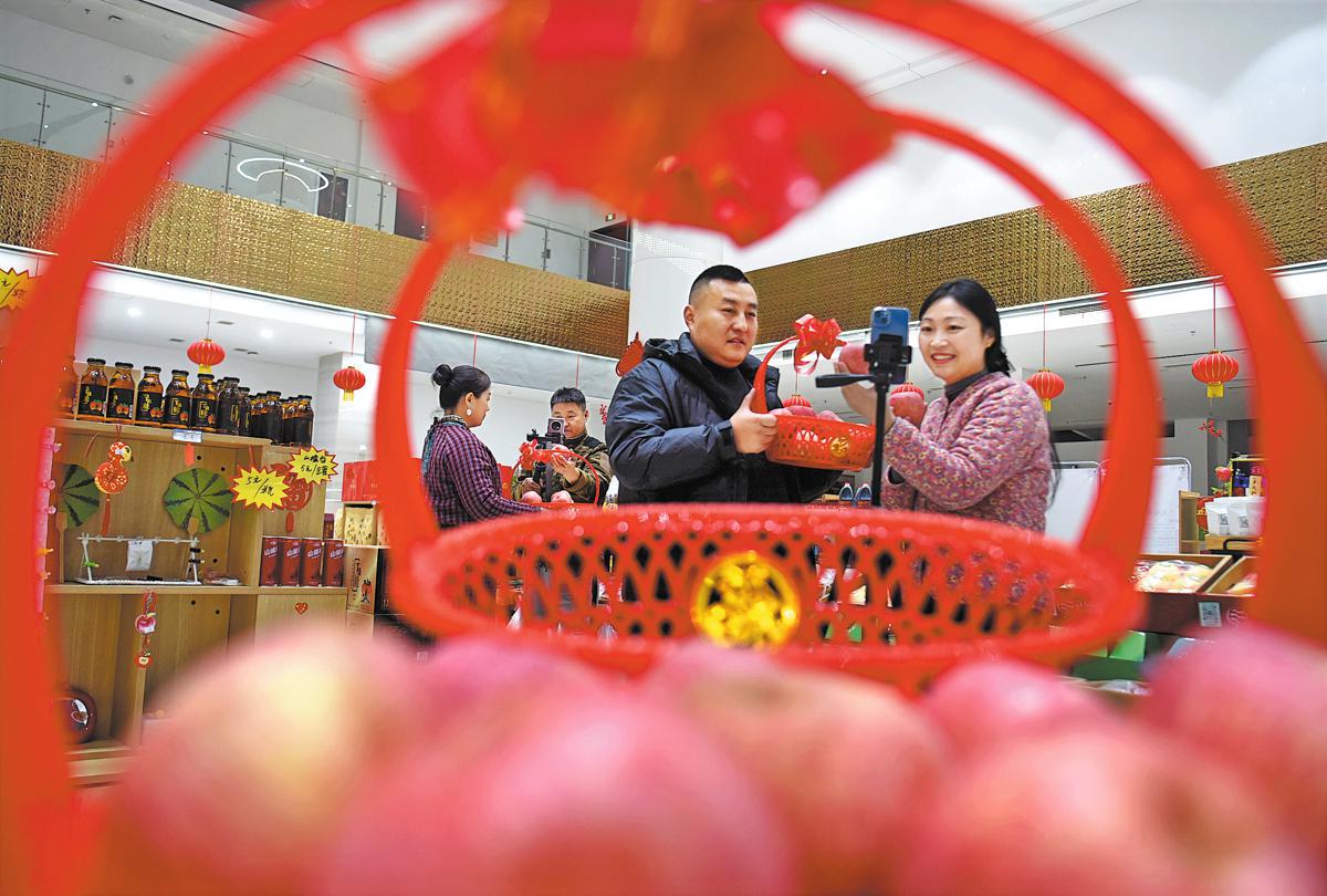 Two couples promote apples through livestreaming from a specialty store in Zhongzhuang service area along the Linzi-Linyi expressway in Zhongzhuang township, Zibo city, Shandong province, on Nov 9. ZHAO DONGSHAN/YOU KUIKUI/FOR CHINA DAILY