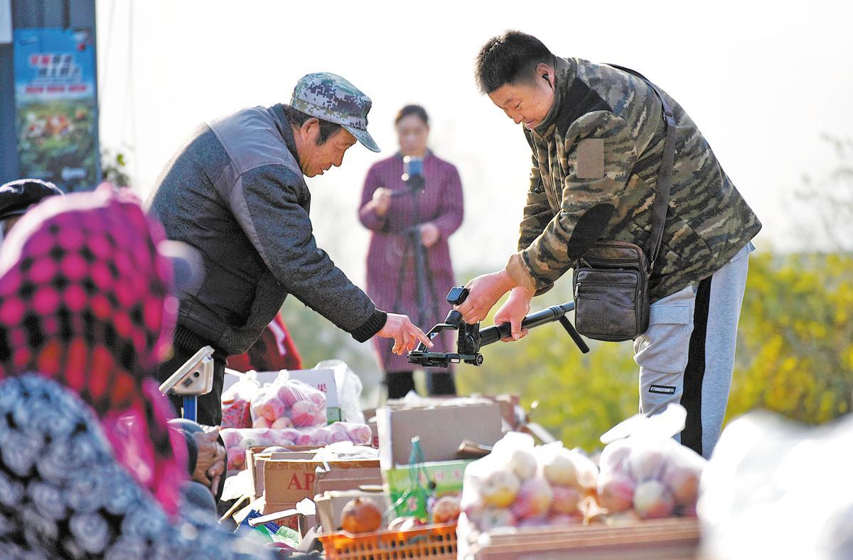 Livestreamers introduce local apples from the Zhuquan apple market in Zhongzhuang township, Zibo city, Shandong province, on Nov 9. ZHAO DONGSHAN/YOU KUIKUI/FOR CHINA DAILY