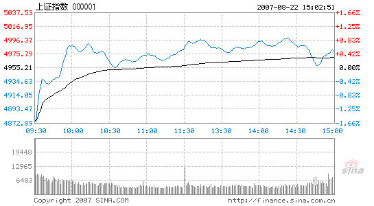 The Shanghai Composite Index opened 78.86 points lower at 4,876.35, and hit the lowest 4,861.27 after the opening. But soon it returned to higher levels. As it moved toward the 5,000-point mark, the downward pressures increased. At its highest of 4,999.20, the index was immediately dragged down by selling bids on individual stocks. Finally, it closed at 4,980.08, 24.87 points or 0.5 percent higher than the previous close.