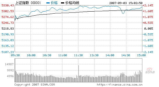Updated: 2007-09-03 16:26 Inspiring performance in the coal sector and the absence of negative news over the weekend drove major stock indexes well above the 5,300-point level on Monday despite the bourse's warnings against excessive speculations. The benchmark Shanghai Composite Index opened at 5257.78 points, nearly 40 points higher than last weekend's close. It wasn't long before the index conquered another landmark, 5,300 points, around 10 am. After touching a new all-time high of 5,327.54 after the noon break, the index lingered a bit lower absorbing huge encashment pressure after the surge. It wrapped up Monday's trading at 5,321.06 points, 1.96 percent higher than last Friday's close. Market turnover rose to 191 billion yuan (US$25.3 billion).