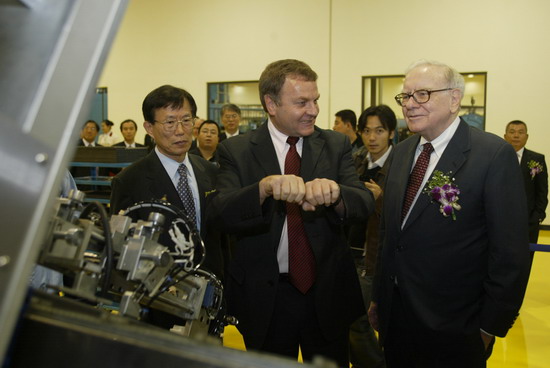 Billionaire Warren Buffett (right) visits a subsidiary of his fund firm in Dalian, Northeast China's Liaoning Province. He cautioned investors against risks as China stocks more than doubled this year. [China Daily]