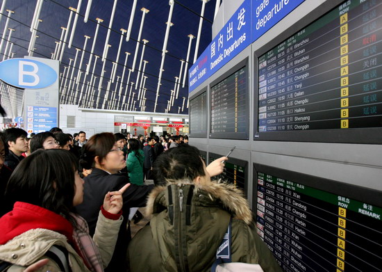 Passengers check flight departure time at Shanghai Pudong International Airport on January 29. Domestic airports handled 387.59 million passengers in 2007, a growth of 16.8 percent year-on-year. [Xinhua]