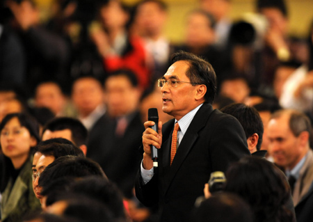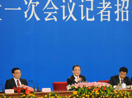 Chinese Premier Wen Jiabao (C) answers a question as Vice-premier Li Keqiang (L) listens during a press conference at the Great Hall of the People in Beijing, following the conclusion of the First Session of the 11th National People's Congress on March 18, 2008. [Xinhua]