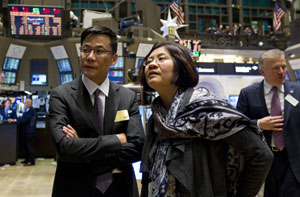 Li Guoqing (left), co-founder and chief executive officer of E-Commerce China Dangdang Inc, and Peggy Yu, co-founder and chairman of Dangdang, tour the floor of the New York Stock Exchange on Dec 8, 2010. Dangdang's stock almost doubled in value in its debut on that day. [Photo/China Daily] |