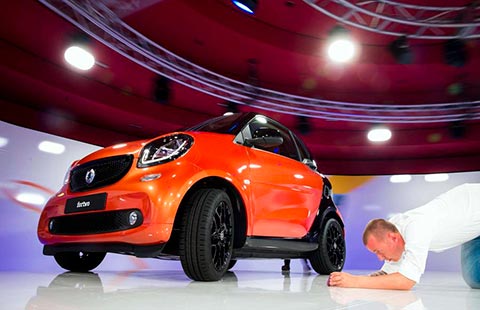 Dieter Zetsche,chairman of the board of of Daimler AG and head of Mercedes-Benz Cars,introduced the colorful smart city cars to an audience from all over the world. [Photo by Li Fangfang/chinadaily.com.cn] |
