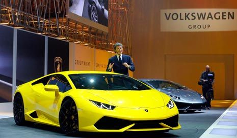 Lamborghini's CEO Stephan Winckelmann speaks next to a Lamborghini Huracan during a Volkswagen Group Night event ahead of the 84th Geneva Motor Show.