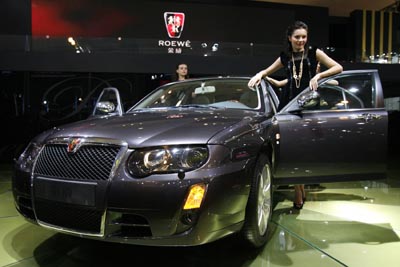 Foreign models pose beside a Roewe 750, made by Chinese carmaker