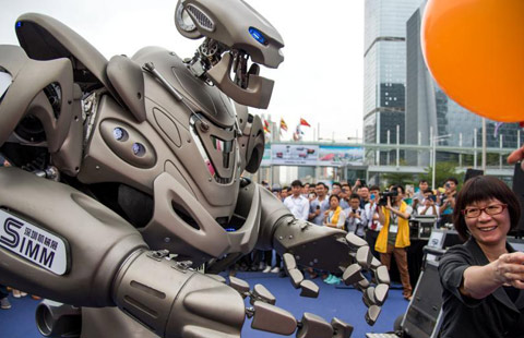 A security guard stands in front of a screen showing Xiaomi mobile phones ahead of the launching ceremony of Xiaomi Phone 4, in Beijing, July 22, 2014. [Photo/Agencies]