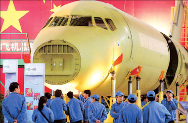 Officials and staff of the China Aviation Industry Corp attend a ceremony to mark the start of assembling the prototype of its first home-grown commercial jet, the ARJ-21, in Shanghai on Friday. The ARJ-21 will come off the production line by the end of 2007 and start test flights in March 2008. [AFP]