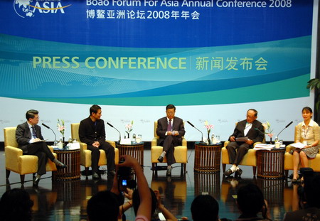 A press conference is held in Boao Forum for Asia (BFA) Annual Conference 2008 in Boao, South China's Hainan Province April 11, 2008. The BFA Annual Conference 2008 opened on Saturday, focusing on the building of a Green Asia. [Xinhua]