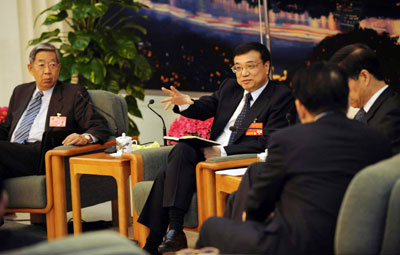 Li Keqiang (2nd L), member of the Standing Committee of the Political Bureau of the Communist Party of China (CPC) Central Committee, meets with deputies to the First Session of the 11th National People's Congress (NPC) from southwest China's Chongqing Municipality in Beijing, capital of China, March 9, 2008. Li Keqiang joined in the panel discussion of Chongqing delegation on Sunday during the First Session of the 11th NPC.[Xinhua]