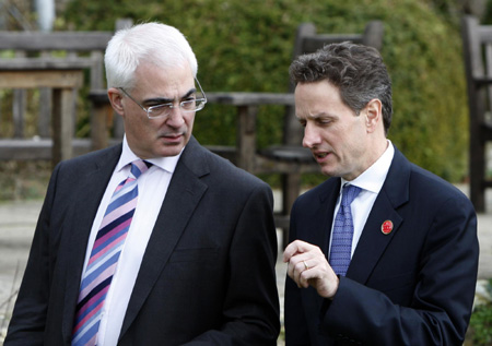 Britain's Finance Minister Alistair Darling (L) and US Treasury Secretary Timothy Geithner walk to have a family photograph taken with finance ministers, central bank governors and heads of institutions during a break in the G20 Finance Ministers meeting at a hotel, near Horsham, in southern England March 14, 2009. [Agencies]
