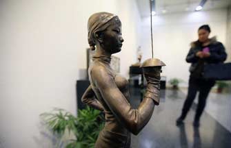 Paintings titled "Crazy Horse Car Door" and in the background, "Kissing Coppers", by the British street artist Banksy, are seen on display at LMNT Gallery in Miami, Florida February 18, 2014. Banksy is auctioning off his famous Kissing Coppers piece at a street art auction in Miami on Tuesday night. Kissing Coppers originally appeared on the side of the Prince Albert Pub in Brighton, England. The wall, weighing about 7,000 pounds, is one of several pieces to be displayed at Fine Art Auctions Miami. [Photo/Agencies] |