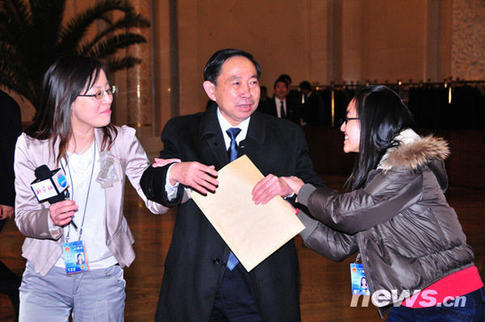 3月11日,十一屆全國人大三次會議和全國政協十一屆三次會議繼續召開。圖為新華社記者邀請教育部部長袁貴仁到媒體區接受采訪。新華網孫巍 攝