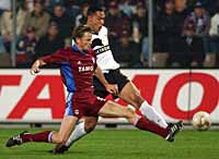 Valencia's John Carew (R) and Servette's Stefan Wolf (R) fight for the ball during their UEFA Cup fourth round, second leg match in Geneva February 28, 2002. [Reuters]