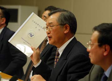 Zhang Wenkang (C), the nation's Health Minister, speaks at a press conference held April 3 in Beijing. He stressed that the Severe Acute Respiratory Syndrome, or SARS, is under control in China and appealed to some foreign organizations and companies that had cancelled their staff's trips to China to re-consider their decisions. [newsphoto.com.cn]