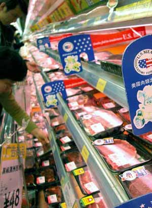 Chinese customers look over beef products at a supermarket in Guangzhou, South China's Guangdong Province, December 24, 2003. China's Ministry of Agriculture has suspended US beef imports after the United States reported its first suspected case of mad cow disease. [newsphoto/file]