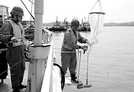 Two staff members of a monitoring zone of red tide in the East China Sea examine water quality.