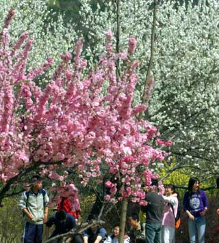 Visitors to the Beijing Botanical Garden in western suburbs savour peach and pear blossoms April 8, 2004, where the Beijing Peach Flower Festival and World Famous Flowers Expo opened. It will last till May 19. [newsphoto]