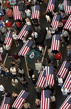 More than 200,000 demonstrators marched past a heavily fortified Republican convention hall on Sunday, chanting denunciations of the administration and the war in Iraq as delegates flocked to the city to nominate U.S. President Bush for four more years in the White House. Vice President Dick Cheney campaigned his way into the convention city three days ahead of the president, praising him as "calm in a crisis, comfortable with responsibility and determined to do everything needed to protect our people." He spoke on Ellis Island, framed by a Manhattan skyline altered irrevocably by terrorism. Bush was in West Virginia, accusing Democratic rival Sen. John Kerry of changing his stand on coal industry issues that are vital to the state's economy. "Be careful of somebody whose position shifts in the wind," he said. Bush presented his standard campaign defense of the war in Iraq, saying, "America and the world are safer because Saddam Hussein sits in a prison cell." But in an interview with Time Magazine, the president suggested he had underestimated the struggle of the postwar period in Iraq. "Had we to do it over again, we would look at the consequences of catastrophic success, being so successful so fast that an enemy that should have surrendered or been done in escaped and lived to fight another day," Bush said. Vice presidential candidate John Edwards responded for Kerry and the Democrats. "President Bush now says his Iraq policy is a catastrophic success. He's half right. It was catastrophic to rush to war without a plan to win the peace," he said. Bush and Kerry are locked in a tight race for the White House, although recent polls suggest momentum for the president. A group of Vietnam veterans have been running commercials accusing Kerry of lying about his decorated service in Vietnam, allegations that official Navy documents dispute and Kerry has denounced as a Republican-driven smear. Still, fellow Democrats concede the unsubstantiated claims may be hurting his candidacy. Polls show the war in Iraq has become increasingly unpopular in recent months, and the throng of protesters filling 20 city blocks on a steamy Manhattan afternoon underscored that. "No More Bush," and "No More Years," were two of the more popular chants. "Bush Lies, Who Dies?," read some of the signs. Several protesters carried flag-draped, coffin-shaped boxes through the streets, meant to draw attention to the U.S. death toll in Iraq. The Pentagon says 969 Americans have died in action, including 831 since Bush stood on an aircraft carrier more than a year ago before a banner that read "Mission Accomplished." Police gave no official crowd estimate of the day's protest. One official put the size at 120,000, although it took nearly five hours for the procession to pass Madison Square Garden. Delegates meet there beginning Monday to nominate Bush and Cheney for second terms. Organizers claimed they had turned out roughly 400,000 protesters. In all, about 100 arrests were reported, with no major outbursts of violence. At mid-afternoon, a small fire erupted along the protest route a half block from the Garden. Police quickly doused the flames, then handcuffed two people and led them away. Thousands of police, some dressed in riot gear, others bearing automatic weapons, watched as the protesters passed. Extensive as it was, the force represented only a portion of an unprecedented security deployment designed to protect the city, New Yorkers and Republicans during the convention week. Homeland Security Secretary Tom Ridge said last week the efforts would include air surveillance over the city, monitoring activity in the harbor and stationing security personnel at every hotel housing any of the 2,508 delegates or 2,344 alternates. After months of appealing to his conservative supporters, Bush and his convention planners scripted a program pitched toward the political middle, independents and wavering Democrats. Sen. John McCain was on the program for the convention's opening night Monday. The Arizona Republican has widespread appeal among independents that stems in part from his own presidential campaign four years ago and his drive for campaign finance reform. California Gov. Arnold Schwarzenegger, who espouses a more moderate brand of Republicanism than the president, speaks Tuesday night. Democratic Sen. Zell Miller of Georgia delivers the keynote address on Wednesday.