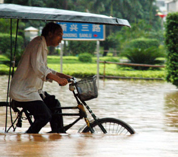 A local resident cycles forward in downtown Wuzhou city, Southwest China's Guangxi Zhuang Autonomou Region June 21, 2005. The city faces flood threat after days of heavy rain. [newsphoto]