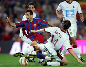 Barcelona's French soccer player Giuly (L) fights for the ball with Mallorca player Francisco Maciel during their Spanish League soccer match in Barcelona, Spain, September 11, 2005. FC Barcelona won 2-0. [Reuters]