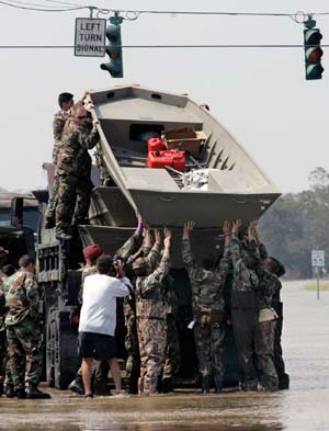 Army engineers unload boats to assist local authorities in search and rescue missions after Hurricane Rita's storm surge flooded Delcambre, Louisiana about 30 miles (48 kms) south of Lafayette September 25, 2005. U.S. President George W. Bush said on Sunday that Congress ought to consider giving the U.S. military the lead role in responding to natural disasters, as he heard one general describe the Hurricane Katrina rescue effort as a "train wreck." [Reuters]