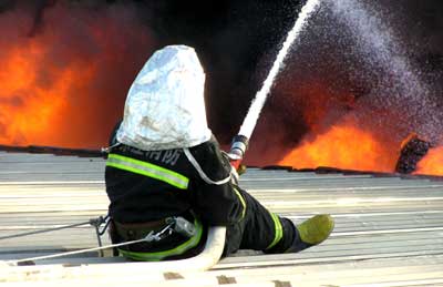 A fireman tries to put out a fire at a packing material company in Luquan, north China's Hebei Province October 14, 2005. Some 100 firefighters were able to extinguish the blaze after about 10 hours. Several thousands square meters of company workshops were destroyed in the fire, but no casualties were reported. The cause of the fire is still under investigation. [newsphoto]