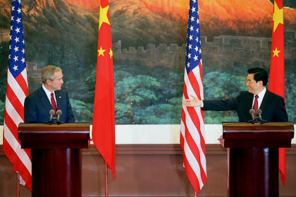 Chinese President Hu Jintao (R) and US President George W. Bush hold a joint press conference after their talks in Beijing November 20, 2005. [newsphoto]