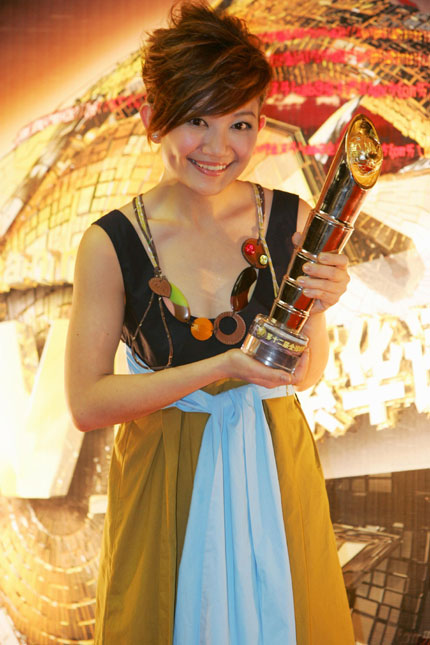Fish Leong poses with the Best Female Singer Award (Taiwan and Hong Kong region) during the Channel V Chinese Music Awards 2006 presentation in Hong Kong January 11, 2006. [Reuters]
