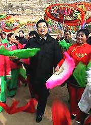 President Hu Jintao joins villagers in folk dance to celebrate the Chinese New Year in Hougoumen Village of Ansai of Yan'an, in northwestern Shaanxi Province on Jan. 28, 2006. [Xinhua]