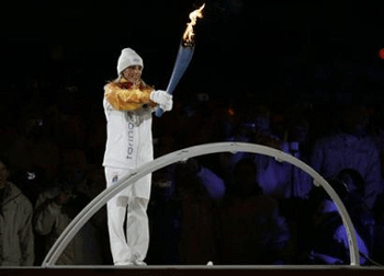 Stefania Belmondo, a three-time gold medal winner in cross-country skiing, prepares to touch the flame to a wire that ignited fireworks and lit the Olympic caldron during the opening ceremony for the Turin 2006 Winter Olympic Games Friday, Feb. 10, 2006 in Turin, Italy. [AP]