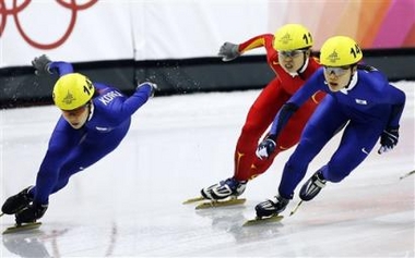 Gold medalist Korea's Jin Sun-Yu, left, leads fellow countryman Choi Eun-Kyung, right, and China's Wang Meng in the women's 1500 meter final at the Short Track Speed Skating competition at the Turin 2006 Winter Olympic Games in Turin, Italy, Saturday, Feb. 18, 2006. Korea's Choi Eun-Kyung took the silver medal and China's Wang Meng the bronze. [AP]