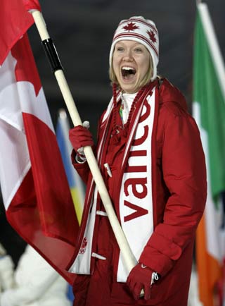 Canada's Cindy Klassen carries her country's flag during the closing ceremony at the Torino 2006 Winter Olympic Games in Turin, Italy, February 26, 2006. [REUTERS]