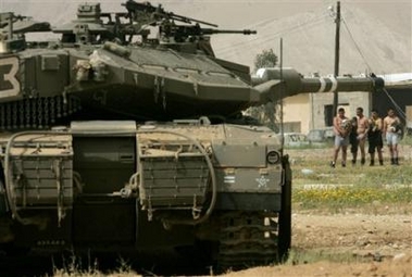 Palestinian prisoners stand in their underwear as an Israeli tank takes a position outisde the prison during an army raid in the West Bank town of Jericho, Tuesday, March 14, 2006. Israeli forces backed by bulldozers and tanks laid siege to a prison in the West Bank town of Jericho on Tuesday, pulling out scores of prisoners and guards and destroying much of the building before capturing a group of prisoners linked to the assassination of an Israeli Cabinet minister. [AP]
