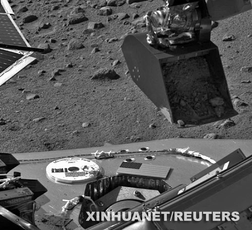 這張美國宇航局6月6日發布的照片顯示的是“鳳凰”號火星著陸探測器6月5日拍攝的“鳳凰”號挖掘臂挖掘火星土壤的情景。新華社/路透