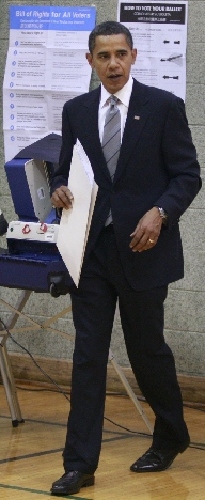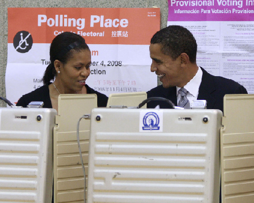 中國(guó)日?qǐng)?bào)網(wǎng)環(huán)球在線消息:美國(guó)當(dāng)?shù)貢r(shí)間11月4日早上7點(diǎn)30分,民主黨總統(tǒng)候選人奧巴馬前往芝加哥一投票站投票。在妻子米歇爾和兩個(gè)女兒的陪同下,奧巴馬來到位于芝加哥比拉?林史密斯小學(xué)的投票站,領(lǐng)到選票后隨即進(jìn)入投票廂填寫選票。當(dāng)奧巴馬微笑著說“我投完票了”后,在場(chǎng)的其他選民爆發(fā)出熱烈掌聲。(環(huán)球在線:霍默靜)