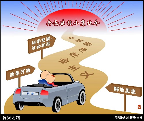 “在當代中國,堅持中國特色社會主義道路,就是真正堅持社會主義。”十七大報告中這句話擲地有聲、鏗鏘有力。十七大代表們認為,走中國特色社會主義道路,是中國進一步實現民族振興、國家富強、人民幸福、社會和諧的必由之路。而解放思想,改革開放,科學發展、社會和諧,全面建設小康社會,共同構成了發展中國特色社會主義的思想保證、強大動力、基本要求和奮斗目標,是堅持走中國特色社會主義道路的關鍵所在,更是中華民族復興的根本保證。新華社發