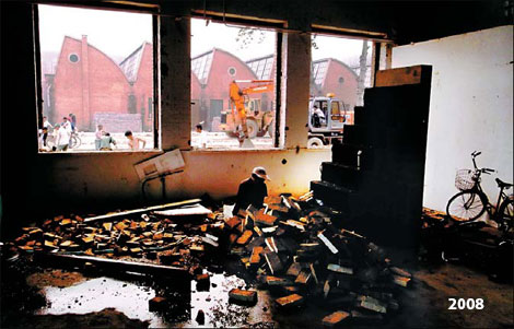 照片中一個工人在做翻修工作。他的勞動成果在另一張照片中可以看到,這也就是翻新之后的798工廠。如今,隨著大部分乏味的工業車間和辦公間轉型成為畫廊和創意工作室,798也成為了北京的藝術家、藝術品經銷商、藝術愛好者乃至游客最喜歡光顧的一個地點。