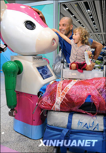 9月2日,“福牛樂樂”機器人在機場迎候參加殘奧會的外國運動員。