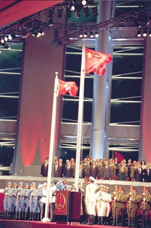 1997年7月1日零時,中華人民共和國國旗和香港特別行政區區旗,在香港會展中心中英香港政權交接儀式上升起。新華社特供本報圖片