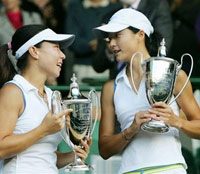 Yan Zi (R) and Zheng Jie of China hold their Women's Doubles Championship trophies on the Centre Court at Wimbledon, July 9, 2006. [AP Photo]