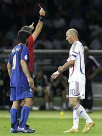 在本屆世界杯決賽進行到第110分鐘時,齊達內頭撞馬特拉齊的胸口,這位三屆“世界足球先生”由此成為世界杯歷史上第四位在決賽中被罰下場的球員。