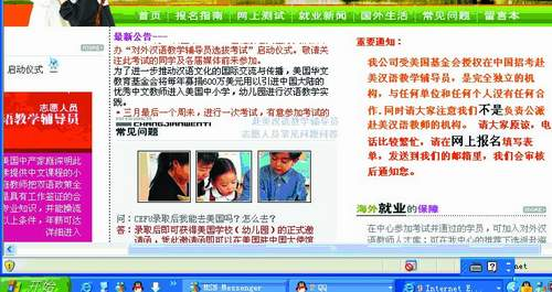 記者在該公司網(wǎng)站上看到,一方面公司宣稱:美國華文教育基金會將每年募捐600萬美元用以引進中國內(nèi)地的優(yōu)秀中文教師進入美國中小學(xué)、幼兒園進行漢語教學(xué)實踐活動,另一方面又發(fā)緊急通知,稱公司受“美國基金會”授權(quán)在中國招考赴美漢語教學(xué)輔導(dǎo)員。兩個基金會是什么關(guān)系,記者不得而知。