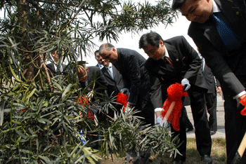 肖卡特·阿齊茲總理與隨行訪問人員抵達(dá)我校江安校區(qū)時,受到校長謝和平院士等校領(lǐng)導(dǎo)和手持中巴兩國國旗的500余名川大師生的熱烈歡迎。阿齊茲總理與省上領(lǐng)導(dǎo)、校領(lǐng)導(dǎo)一起在我校江安校區(qū)共同植下了中巴友誼樹。植樹活動結(jié)束后,阿齊茲總理出席了四川大學(xué)與巴基斯坦駐華大使館、四川大學(xué)與巴基斯坦旁遮普大學(xué)的合作協(xié)議簽字儀式,并為四川大學(xué)巴基斯坦研究中心揭牌,四川大學(xué)校長謝和平院士代表我校領(lǐng)牌。