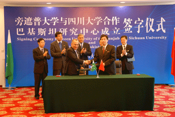 由我校與巴基斯坦駐華大使館共同合作,在我校建立巴基斯坦研究中心,該中心將受托進(jìn)行歷史、文化、社會、經(jīng)濟(jì)、貿(mào)易和環(huán)境領(lǐng)域的全面研究,并制訂這方面的計劃和項(xiàng)目。巴基斯坦研究中心成立后還將組織研討會和有關(guān)教育機(jī)構(gòu)及專門機(jī)構(gòu)的師生互訪。我校將與巴基斯坦旁遮普大學(xué)在教學(xué)、研究及專業(yè)發(fā)展方面進(jìn)行教職員工互換;在學(xué)術(shù)項(xiàng)目、語言及文化體驗(yàn)方面進(jìn)行學(xué)術(shù)交流;開展管理人員相互交流;交換教學(xué)與研究資源;聯(lián)合培養(yǎng)本科生及研究生;開展短期團(tuán)體交換、學(xué)生實(shí)習(xí)等合作。校長謝和平院士與阿齊茲總理互贈了禮品。阿齊茲總理在留言薄上簽名留念。