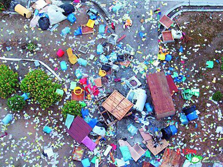 | 數(shù)百名畢業(yè)生“狂歡”過(guò)后的校園,滿地都是從高處拋下的雜物和桌椅