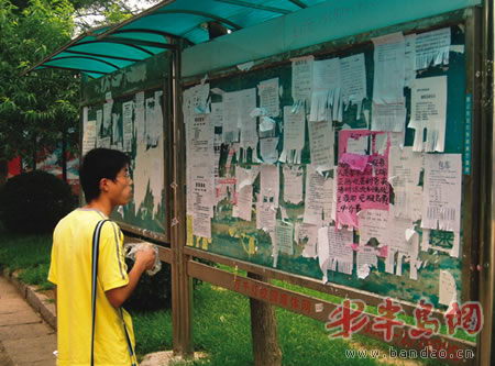 一名大學(xué)生在學(xué)校宣傳欄前瀏覽包車廣告